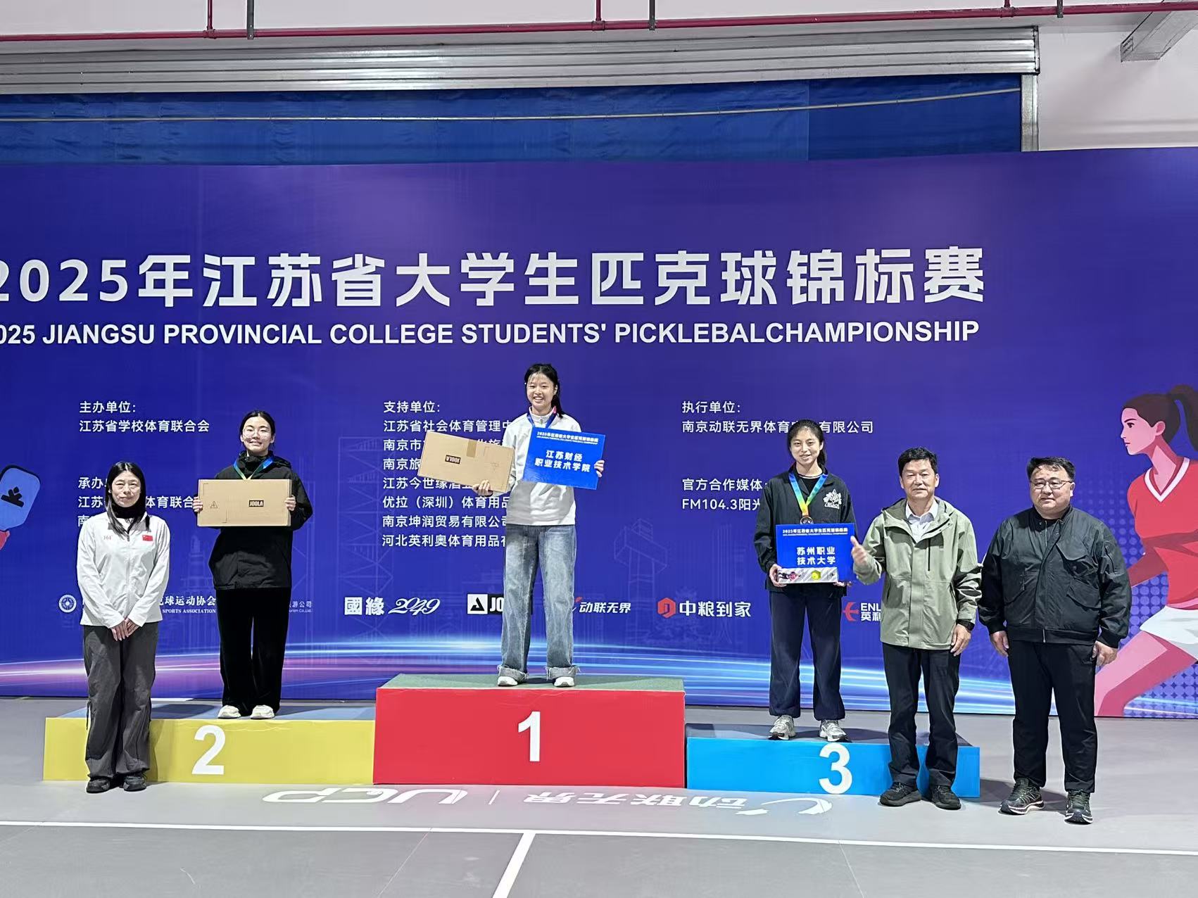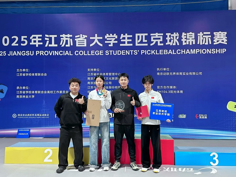 11月5日,在南京林业大学承办的2025年江苏省大学生匹克球锦标赛上,我校代表队取得优异成绩。由体育工作部厉成波老师指导的代表队,最终在37支参赛队伍中脱颖而出,田欣同学凭借出色发挥,荣获女子单打冠军。