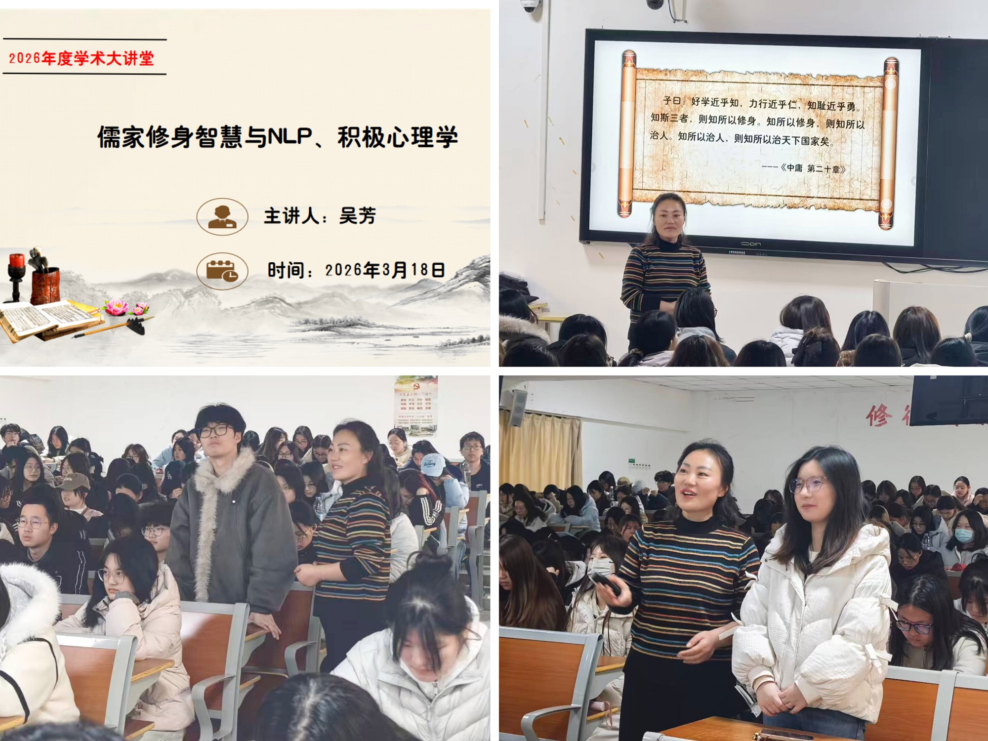 2026年3月18日下午,文瀚楼201教室座无虚席,基础教学部大学语文教研室主任、国家二级心理咨询师吴芳以“儒家修身智慧与NLP、积极心理学”为主题,与金融学院200余名学子开展心灵对话。这是学校2026年度“学术大讲堂”系列活动之一。